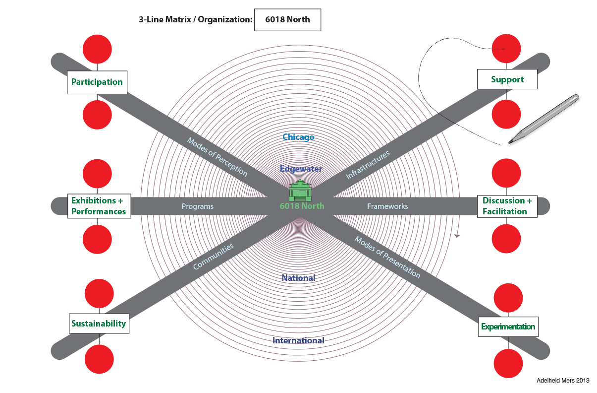 Example 3-Line Matrix organization, 6018North: The non-profit’s mission is shaped around uses of the site and its owner and director’s broader activities as a curator, host and facilitator.