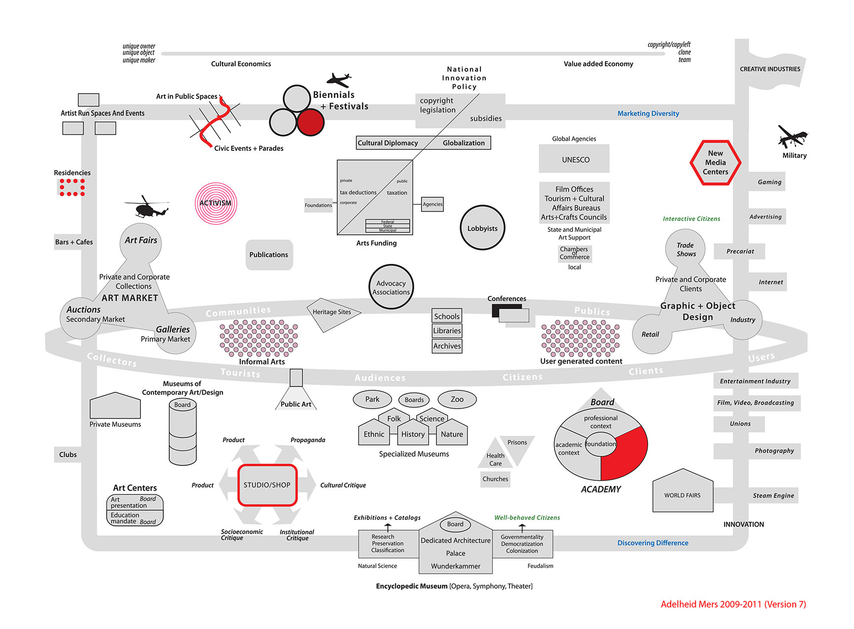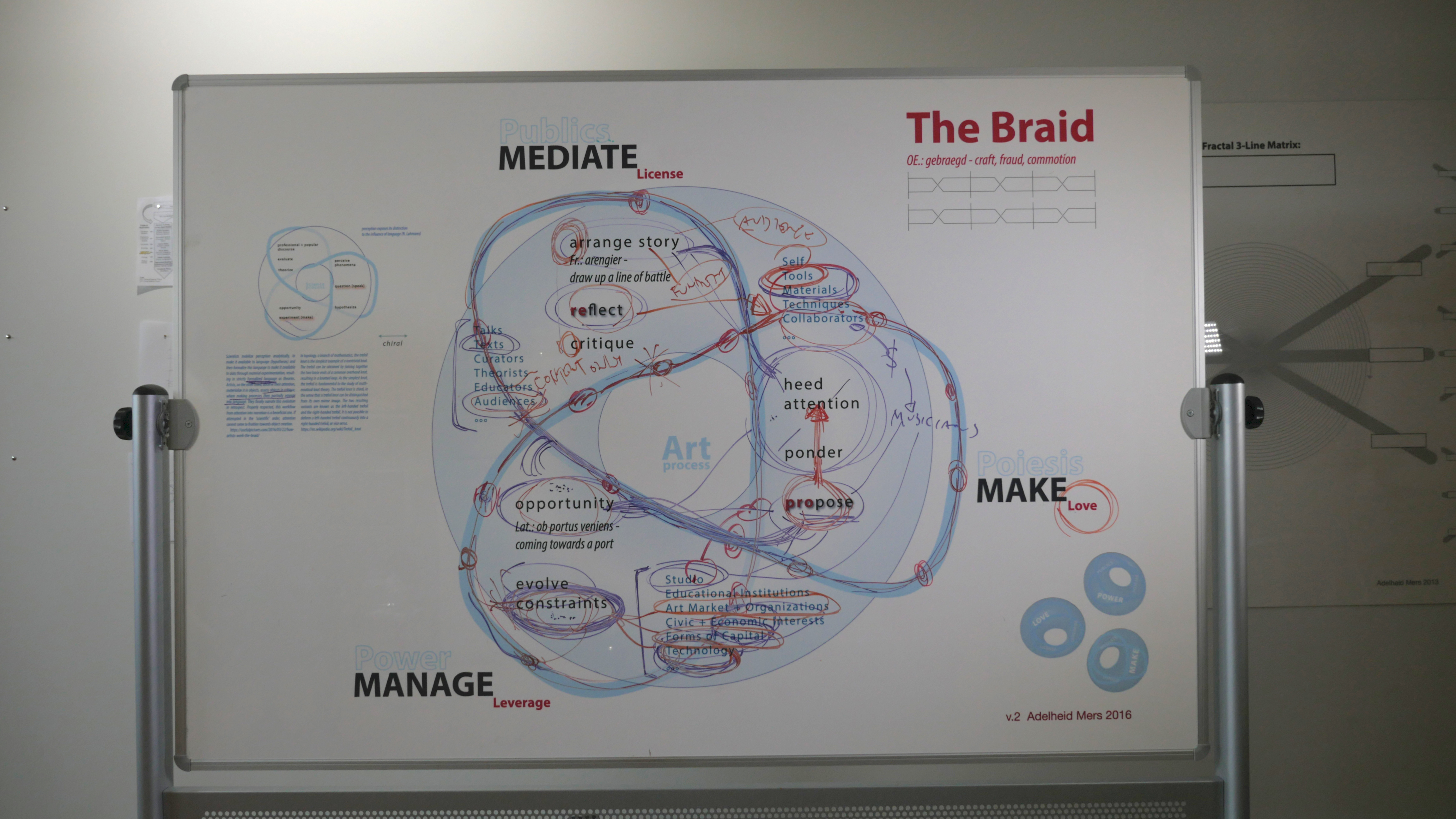 Artist and professor of Arts Administration and Policy at the School of the Arts Institute of Chicago, Adelheid Mers will facilitate diagram-aided conversations about their practices with/among artists, managers, theorists and others who are open to sharing their thinking and experiences.Conversations will be fluidly traced on a Braid Whiteboard and a supporting cast of related diagrams. The Braid diagram presents three domains that may variously combine into an individual art practice,alliteratively tagged Making, Mediating and Managing. Borrowed from Topology, this visualization is intended to serve as an opening and is itself open to transformation by its users. Documentation is encouraged.