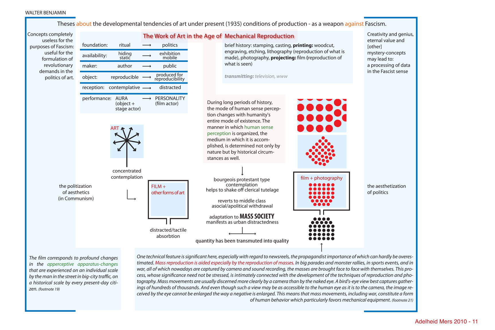 • a summary of Benjamin’s Work of Art in the Age of Mechanical Reproduction that focuses not on the aura, but on political aesthetics;