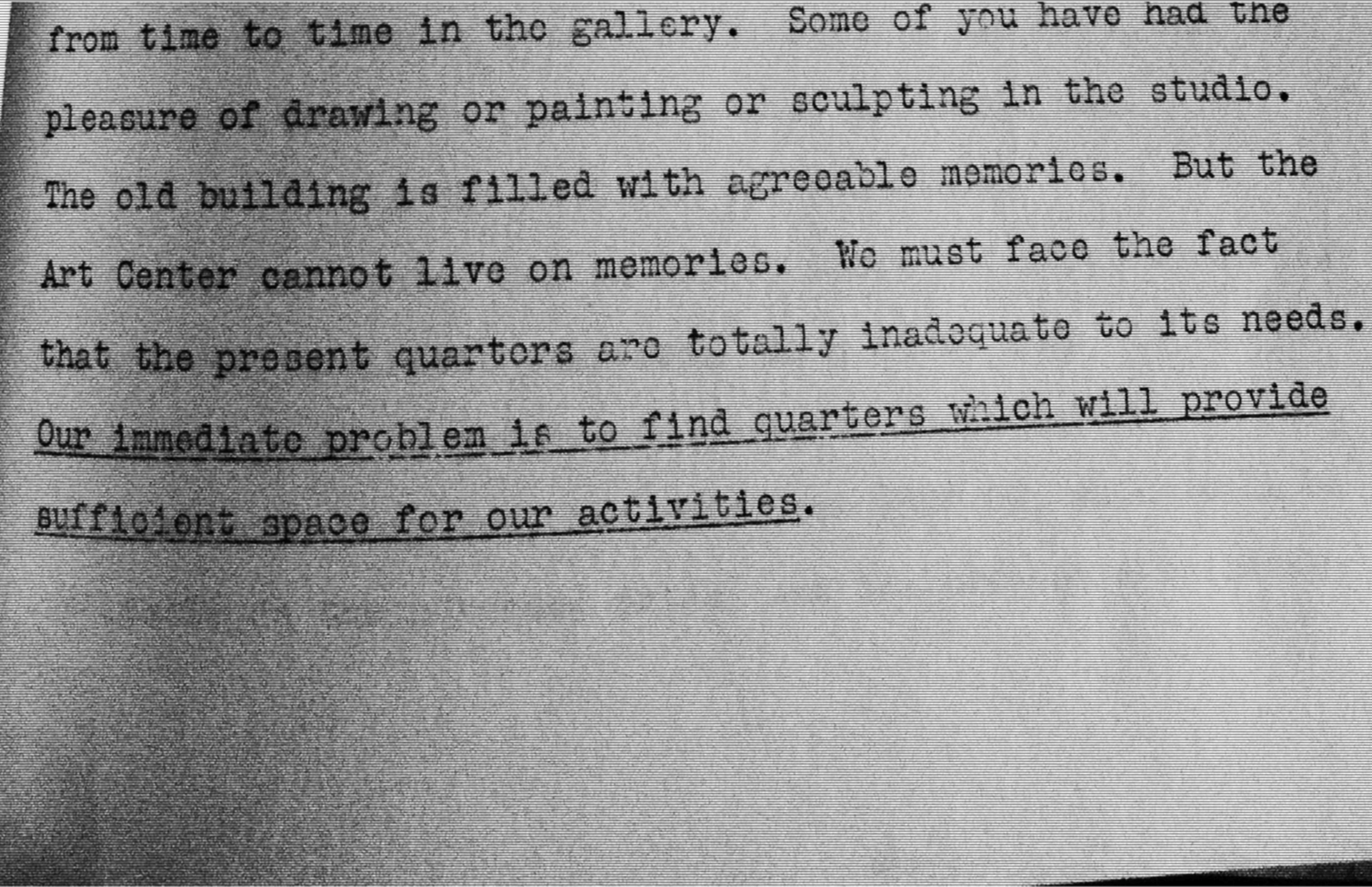 Evanston has a long history of supporting and discussing the arts (The quote pictured above, from the EAC archives, dates to the 1940’s). Recently, there have been surveys and other cultural planning activities. Worldwide, the arts are being reconsidered: as economic drivers, as part of urban planning efforts and as sources of a more broadly understood creativity. These considerations can be highly controversial. They require critical perspectives. As our economies are changing, they should not be ignored. The Evanston Art Center has long been part of these conversations, while it has also undergone a number of incarnations.